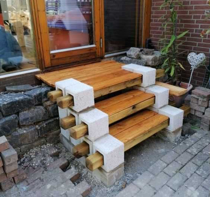 Крыльцо из бетонных пустотелых блоков и деревянных балок — просто, красиво Крыльцо из бетонных пустотелых блоков и деревянных балок —…